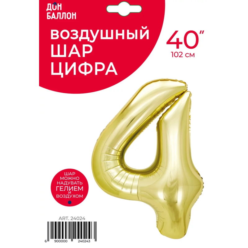 Шар (40''/102 см) Цифра, 4, Белое золото, Металлик, 1 шт. в уп., 24024