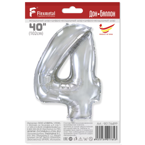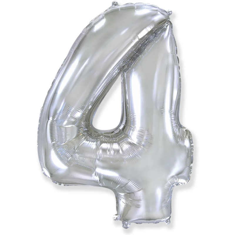 Шар (40''/102 см) Цифра, 4, Серебро, 1 шт. в уп., 901764PP
