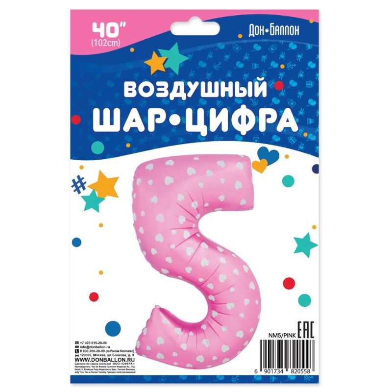 Шар (40''/102 см) Цифра, 5 Сердечки, Розовый, 1 шт. в уп., NMP5/PINK/V