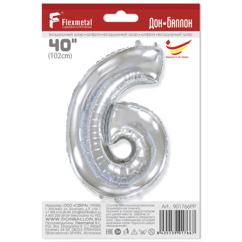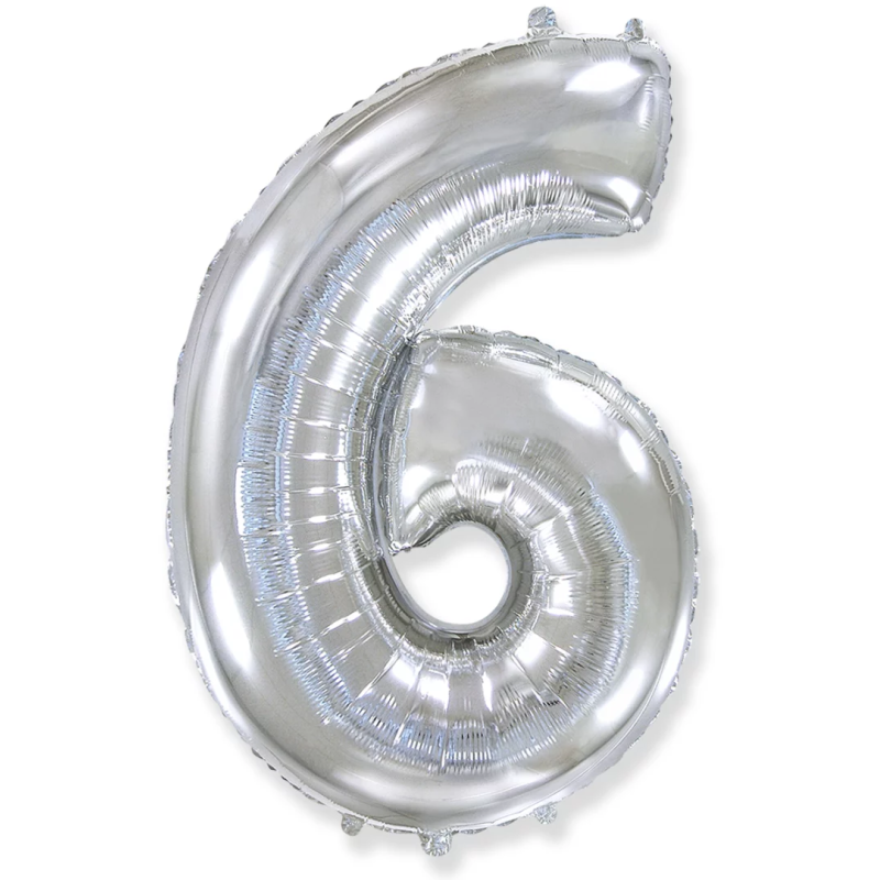 Шар (40''/102 см) Цифра, 6, Серебро, 1 шт. в уп., 901766PP