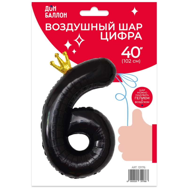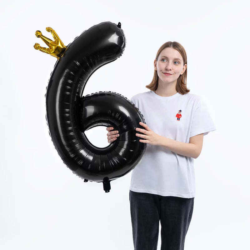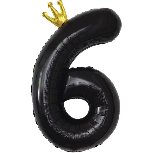 Шар (40''/102 см) Цифра, 6 Золотая корона, Черный, 1 шт. в уп., 131176