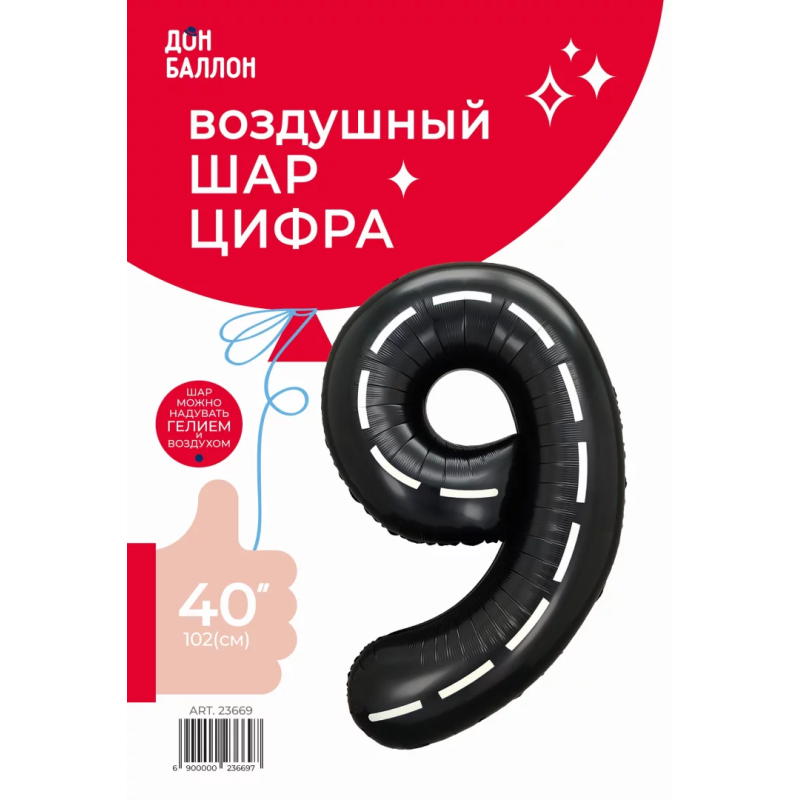Шар (40''/102 см) Цифра, 9 Пит-Стоп, Черный, 1 шт. в уп., 23669