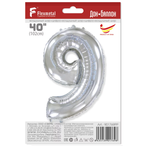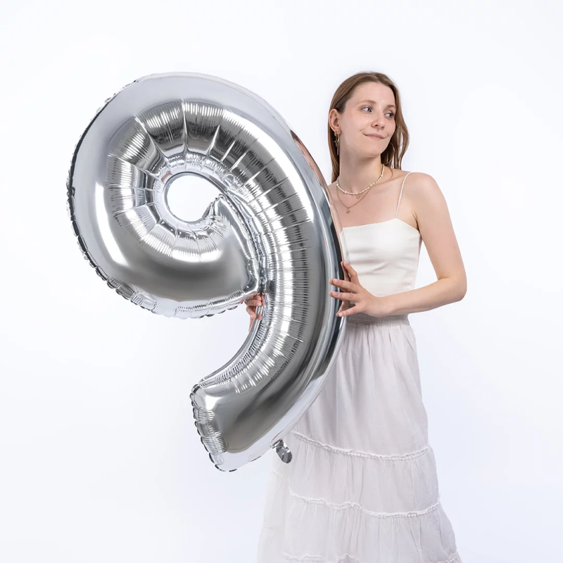 Шар (40''/102 см) Цифра, 9, Серебро, 1 шт. в уп., 901769PP