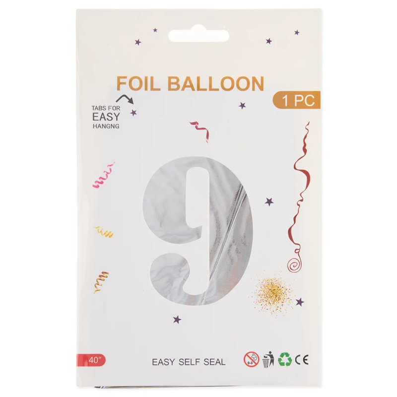 Шар (40''/102 см) Цифра, 9, Серебро, Металлик, 1 шт. в уп., 24099