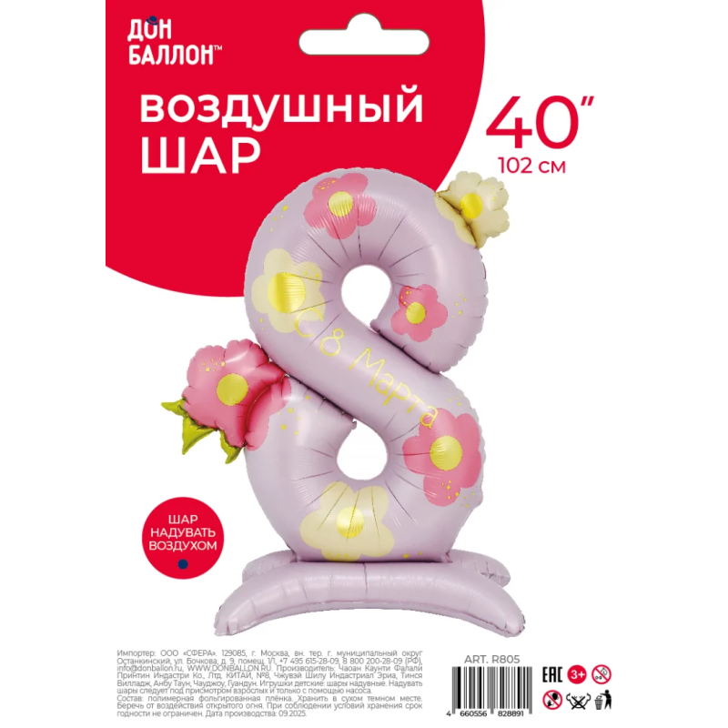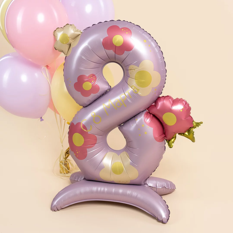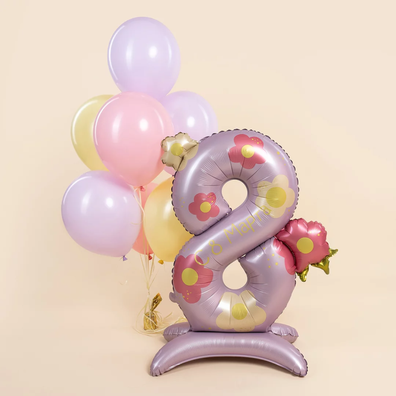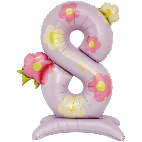 Шар (40''/102 см) Цифра на подставке, 8 Марта, Нежные цветы, 1 шт. в уп., R805