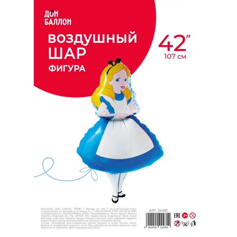 Шар (42''/107 см) Фигура, Девочка Алиса, 1 шт. в уп., 24481