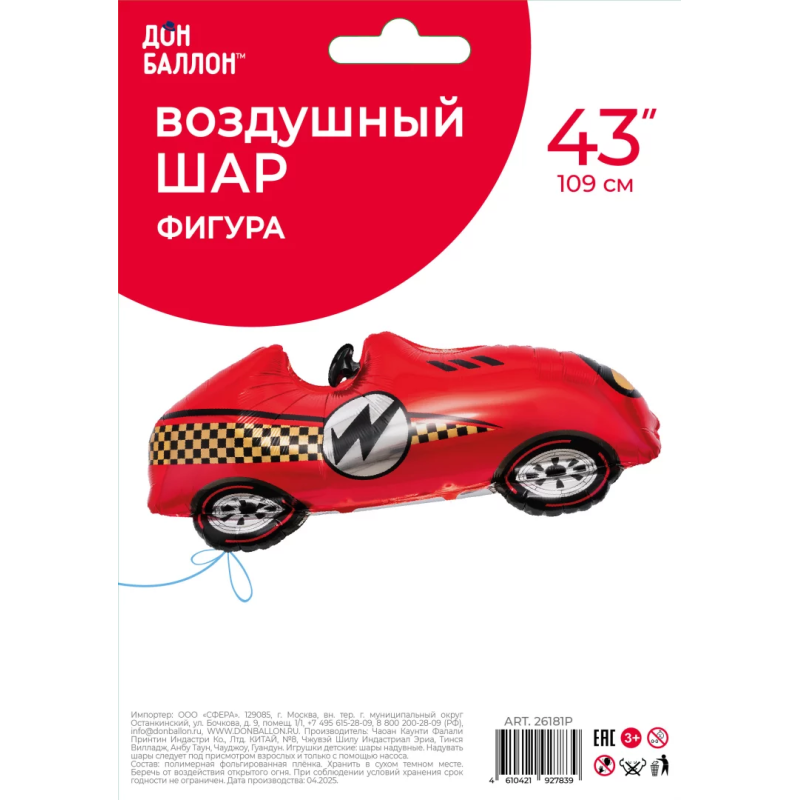 Шар (43''/109 см) Фигура, Гоночная машина, Формула 1, Красный, 1 шт. в уп., 26181P