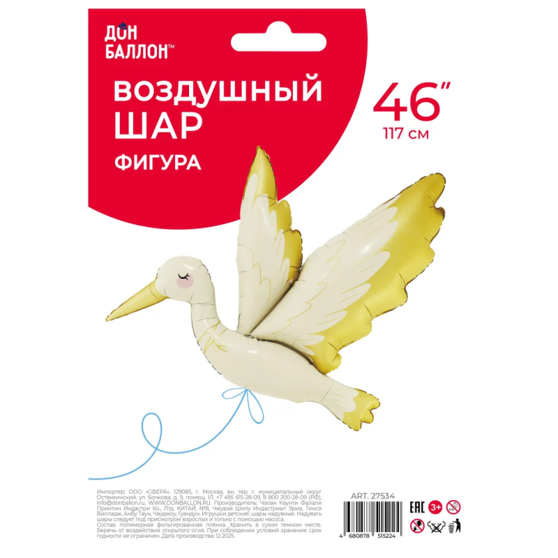 Шар (46''/117 см) Фигура, Золотой Аист, Сатин, 1 шт. в уп., 27534