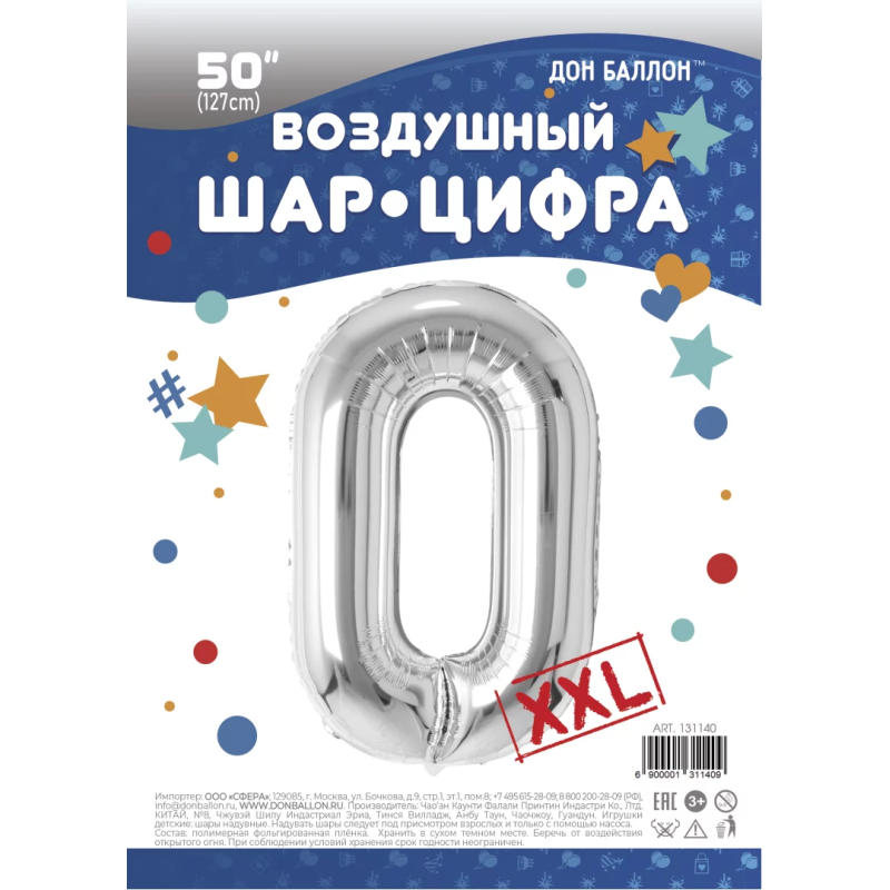 Шар (50''/127 см) Цифра, 0 XXL, Серебро, 1 шт. в уп., 131140