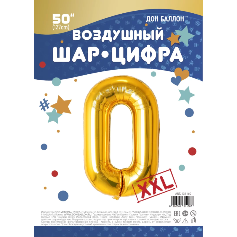 Шар (50''/127 см) Цифра, 0 XXL, Золото, 1 шт. в уп., 131160