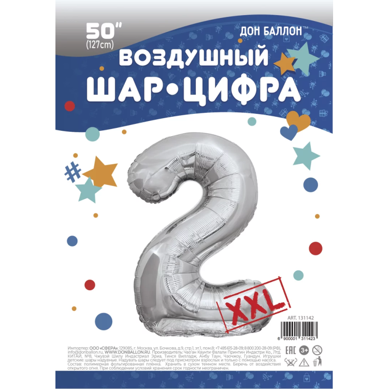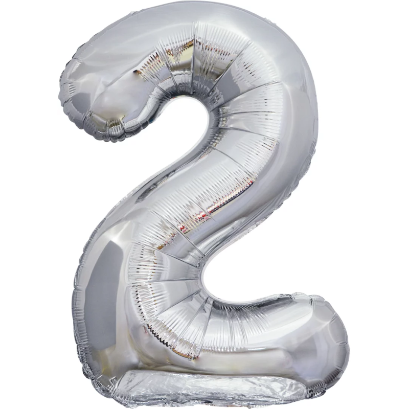 Шар (50''/127 см) Цифра, 2 XXL, Серебро, 1 шт. в уп., 131142