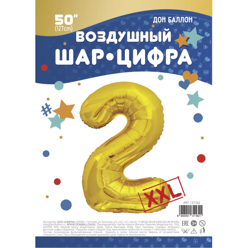 Шар (50''/127 см) Цифра, 2 XXL, Золото, 1 шт. в уп., 131162