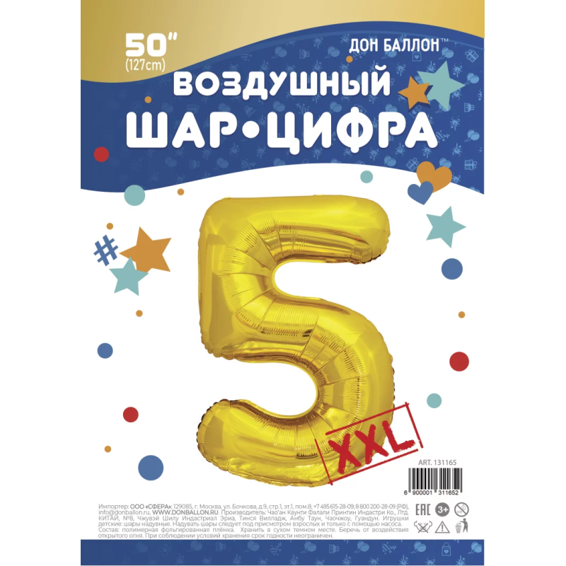 Шар (50''/127 см) Цифра, 5 XXL, Золото, 1 шт. в уп., 131165