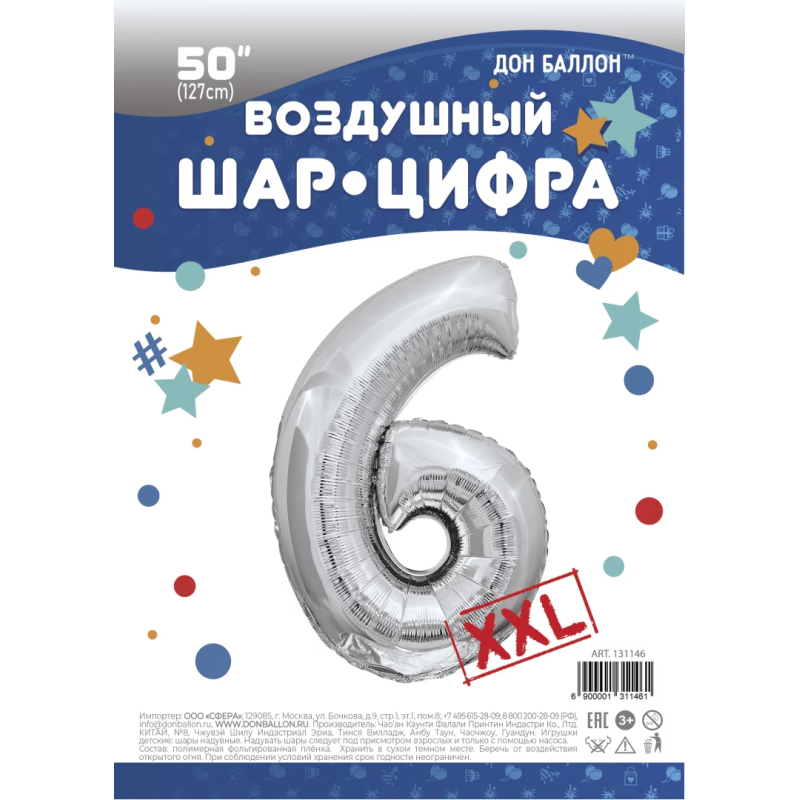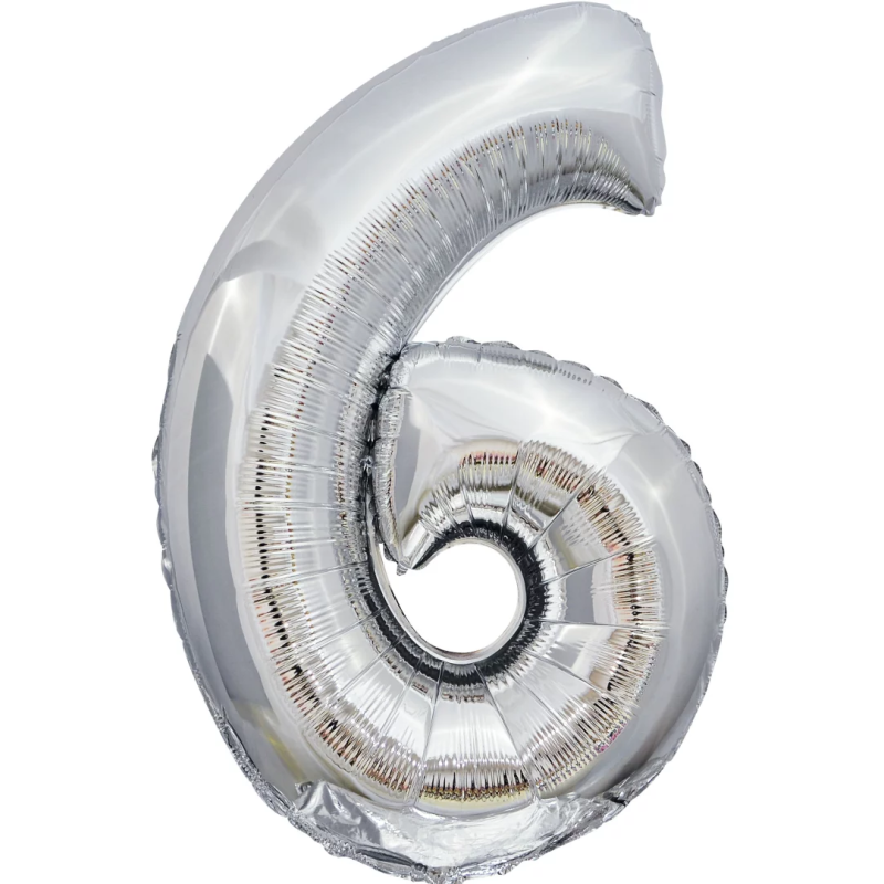 Шар (50''/127 см) Цифра, 6 XXL, Серебро, 1 шт. в уп., 131146
