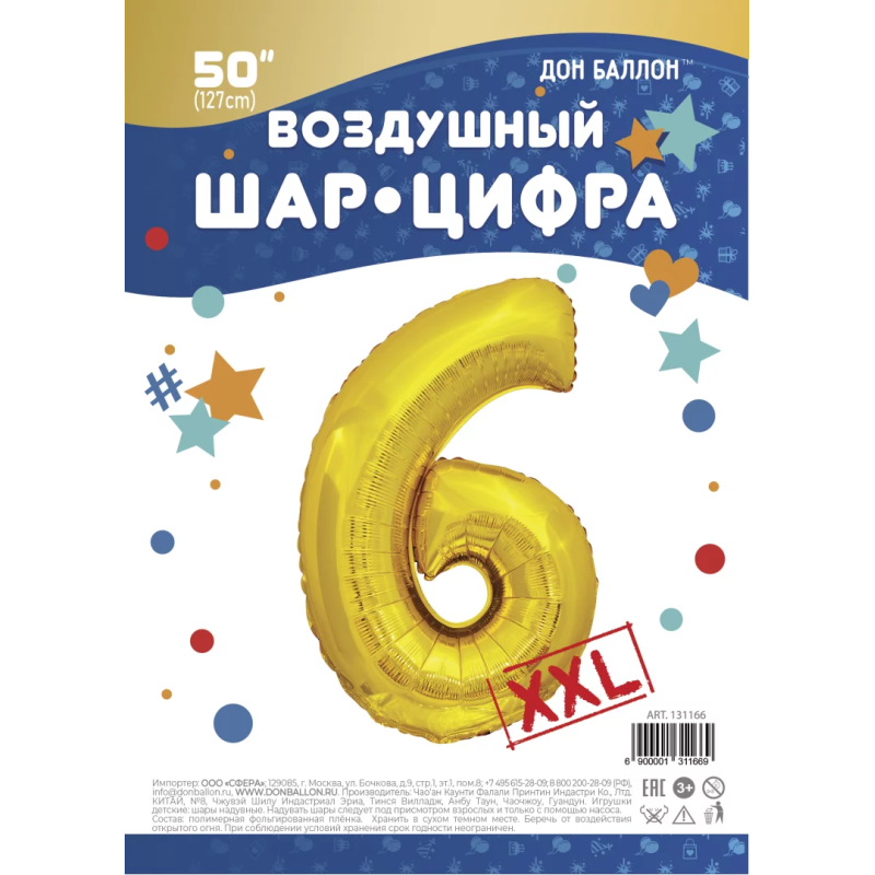 Шар (50''/127 см) Цифра, 6 XXL, Золото, 1 шт. в уп., 131166