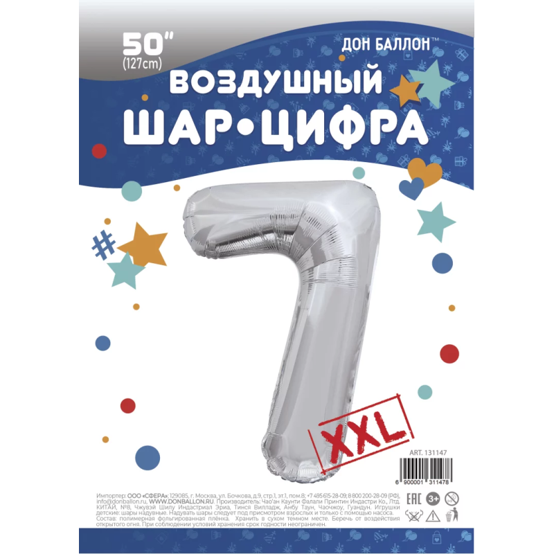 Шар (50''/127 см) Цифра, 7 XXL, Серебро, 1 шт. в уп., 131147