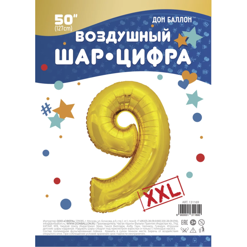 Шар (50''/127 см) Цифра, 9 XXL, Золото, 1 шт. в уп., 131169