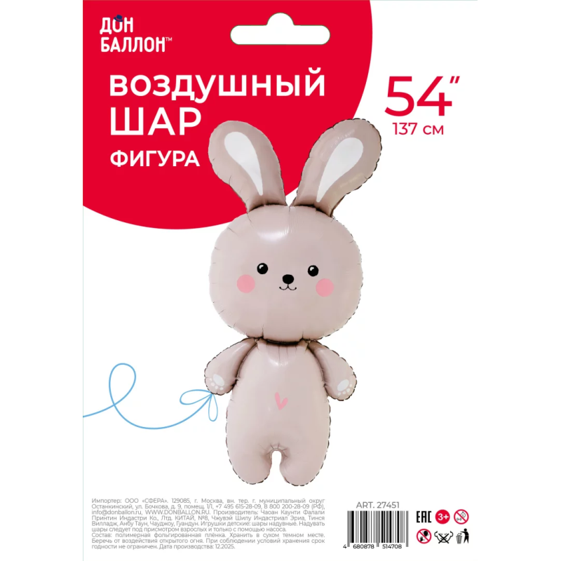 Шар (54''/137 см) Фигура, Зайка, 1 шт. в уп., 27451