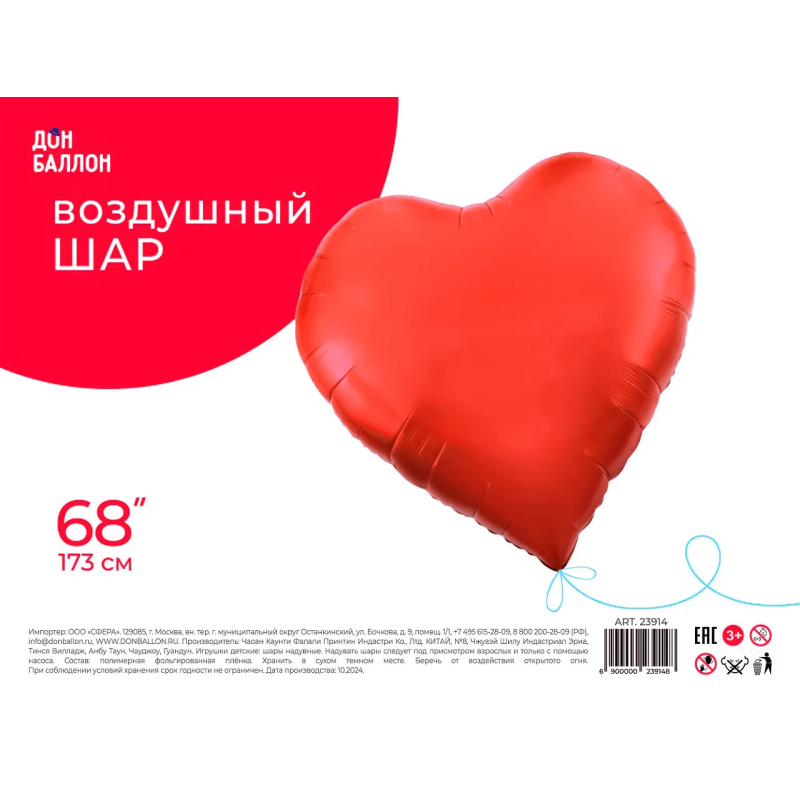 Шар (68''/173 см) Сердце, Красный, Сатин, 1 шт. в уп., 23914