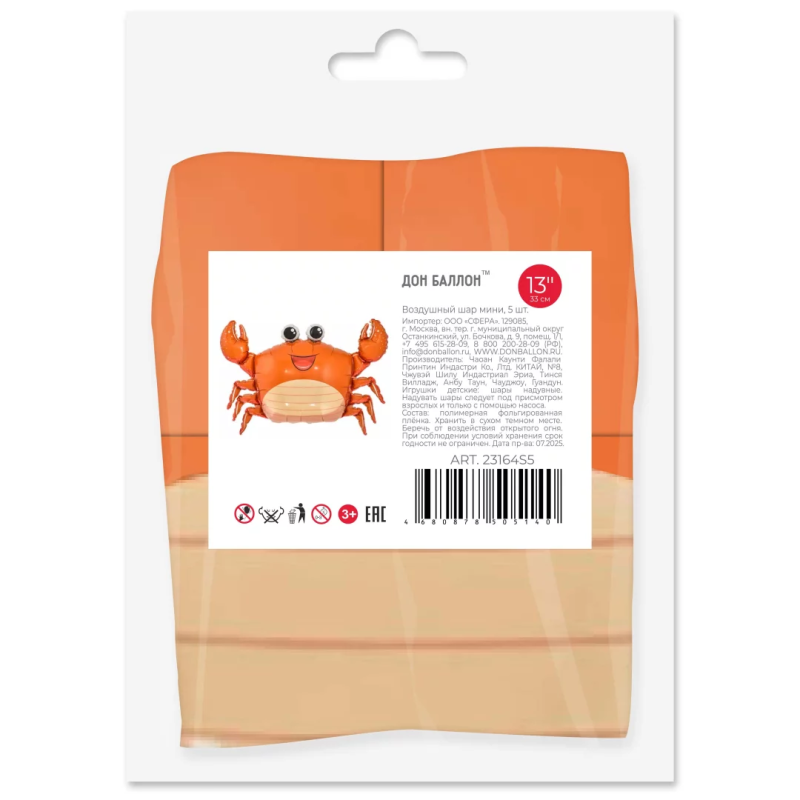 Шар с клапаном (13''/33 см) Мини-фигура, Джесси, Морской краб, 5 шт. в уп. (цв.этик.), 23164S5