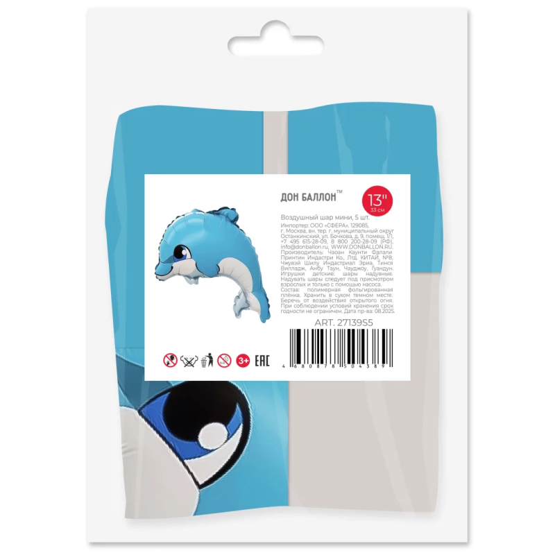 Шар с клапаном (13''/33 см) Мини-фигура, Маленький дельфин, 5 шт. в уп. (цв.этик.), 27139S5