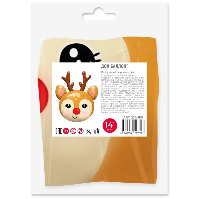 Шар с клапаном (14''/36 см) Мини-фигура, Голова, Маленький Олень, 5 шт. в уп., 23141P5