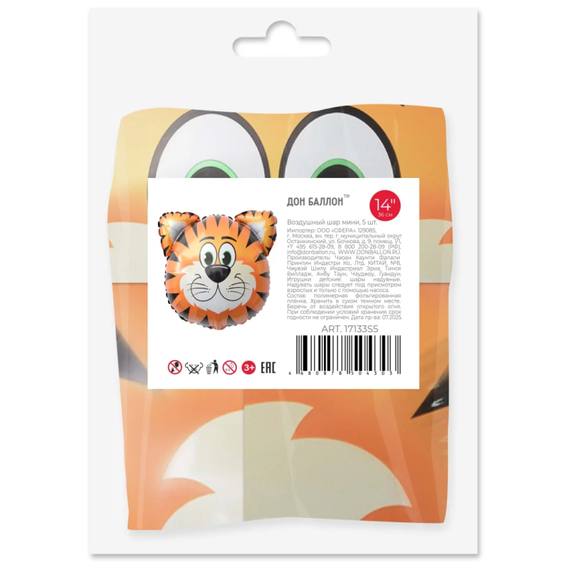 Шар с клапаном (14''/36 см) Мини-фигура, Голова, Тигр, 5 шт. в уп. (цв.этик.), 17133S5