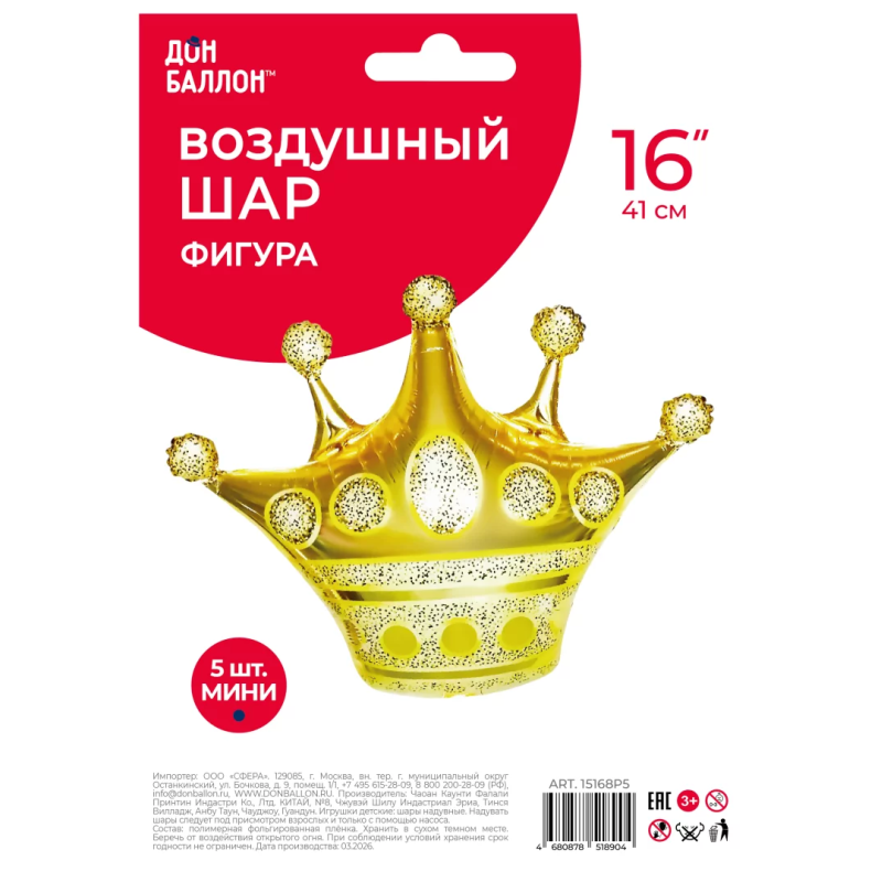 Шар с клапаном (14''/36 см) Мини-фигура, Корона, Золото, 5 шт. в уп., 15168P5