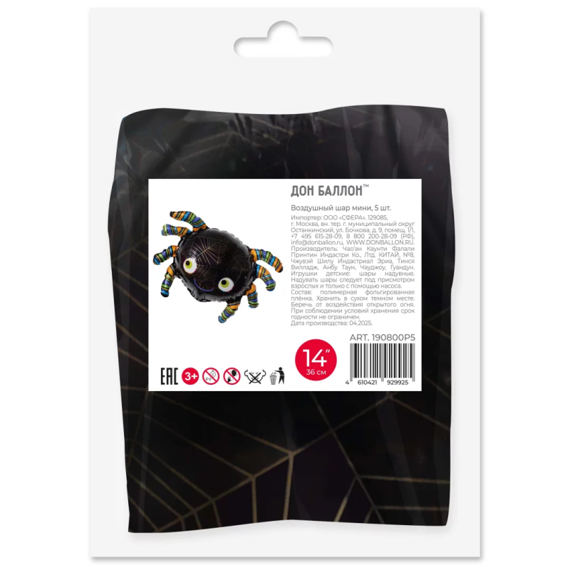 Шар с клапаном (14''/36 см) Мини-фигура, Паук, Черный, 5 шт. в уп., 190800P5