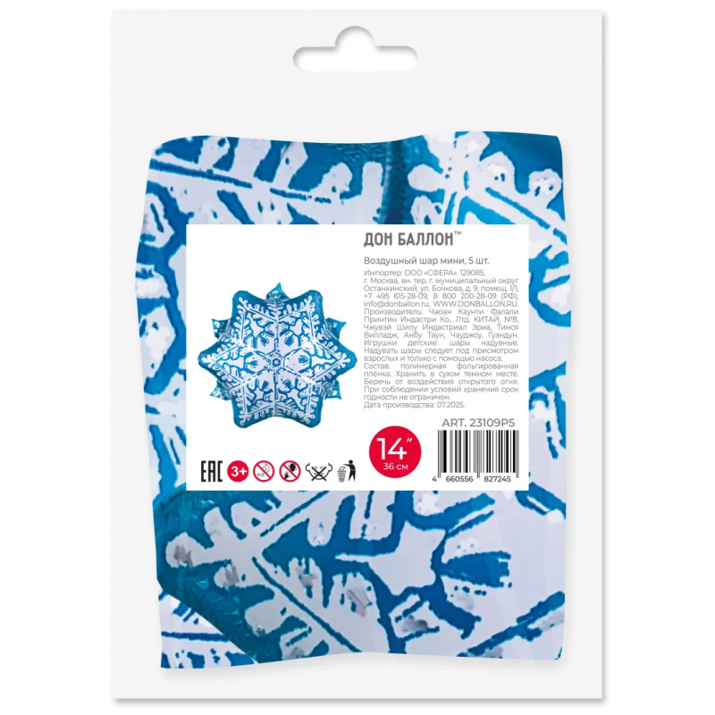 Шар с клапаном (14''/36 см) Мини-фигура, Снежинка, Голубой, 5 шт. в уп., 23109P5