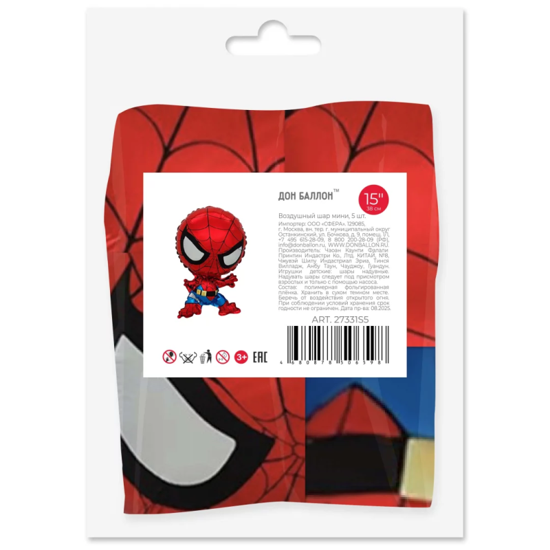 Шар с клапаном (15''/38 см) Мини-фигура, Человек Паук в прыжке, 5 шт. в уп. (цв.этик.), 27331S5