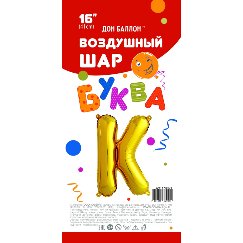 Шар с клапаном (16''/41 см) Мини-буква, К, Золото, 1 шт. в уп., 173921