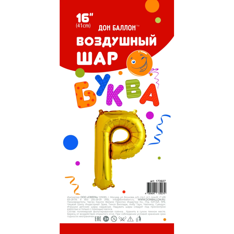 Шар с клапаном (16''/41 см) Мини-буква, Р, Золото, 1 шт. в уп., 173927
