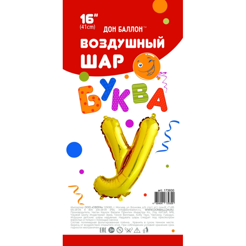 Шар с клапаном (16''/41 см) Мини-буква, У, Золото, 1 шт. в уп., 173930