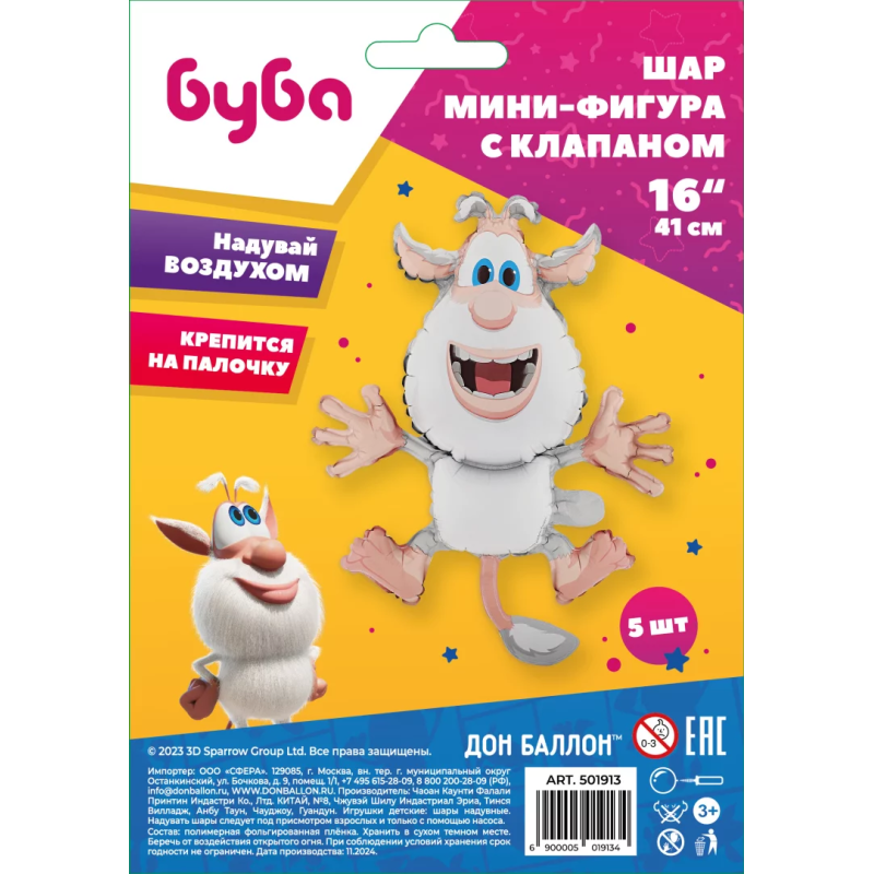 Шар с клапаном (16''/41 см) Мини-фигура, Буба, Белый, 5 шт. в уп., 501913