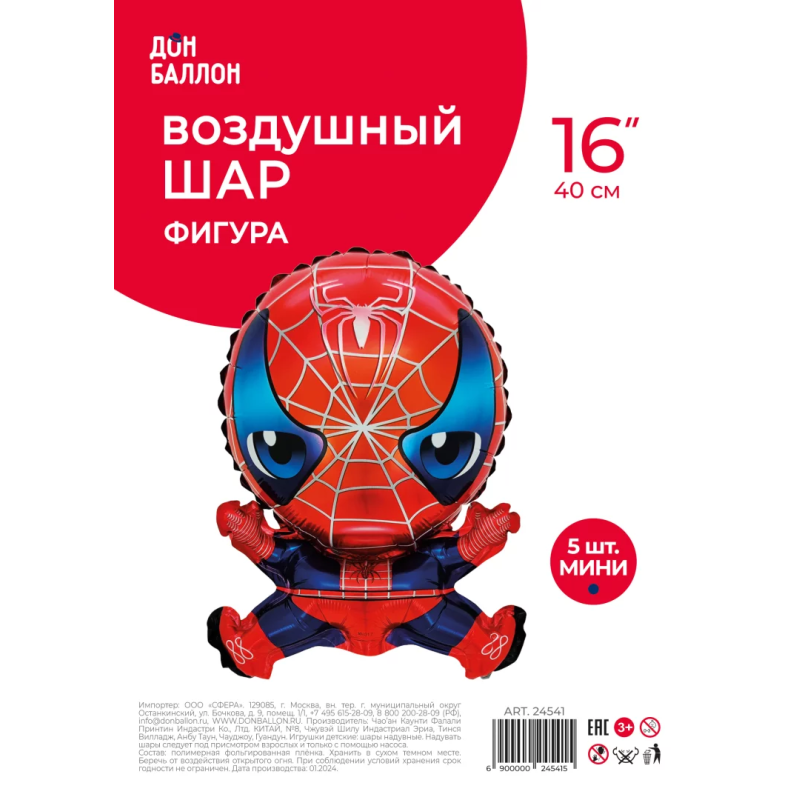 Шар с клапаном (16''/41 см) Мини-фигура, Человек Паук, 5 шт. в уп., 24541