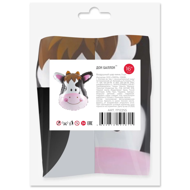 Шар с клапаном (16''/41 см) Мини-фигура, Голова, Милая Корова, 5 шт. в уп. (цв.этик.), 17122S5