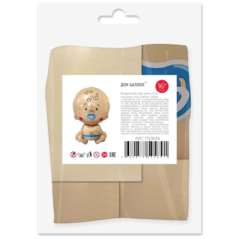 Шар с клапаном (16''/41 см) Мини-фигура, Малыш Мальчик, 5 шт. в уп. (цв.этик.), 17236S5