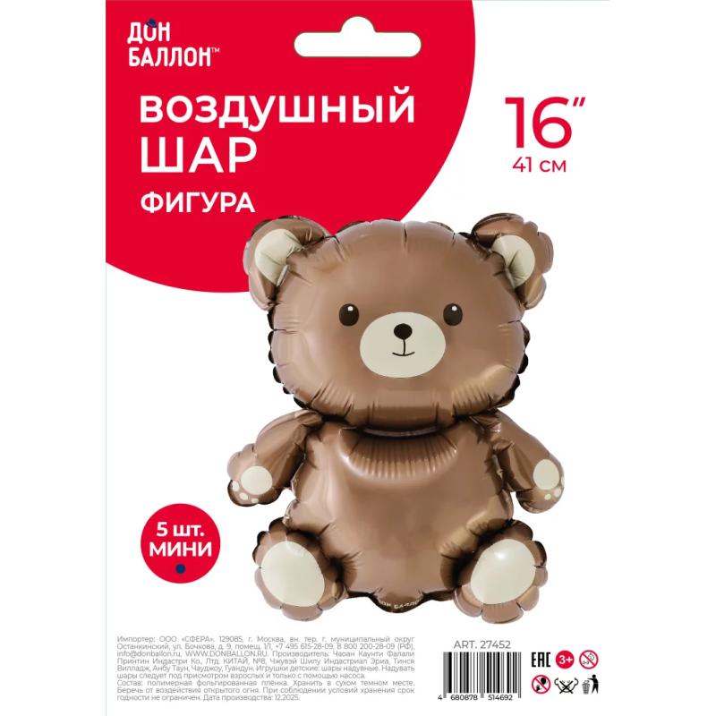 Шар с клапаном (16''/41 см) Мини-фигура, Мишка, 5 шт. в уп., 27452
