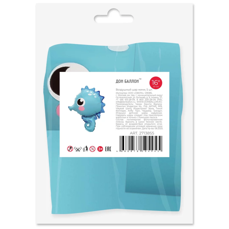 Шар с клапаном (16''/41 см) Мини-фигура, Морской конек, 5 шт. в уп. (цв.этик.), 27138S5