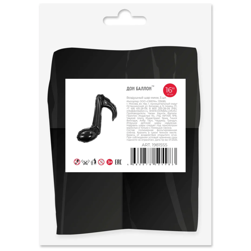 Шар с клапаном (16''/41 см) Мини-фигура, Нота, Черный, 5 шт. в уп. (цв.этик.), 19815S5