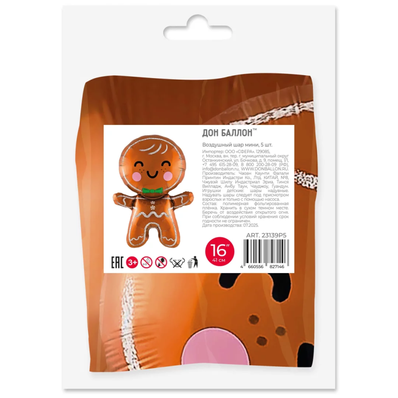 Шар с клапаном (16''/41 см) Мини-фигура, Пряничный человечек, 5 шт. в уп., 23139P5