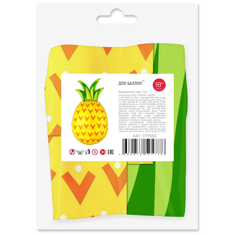 Шар с клапаном (17''/43 см) Мини-фигура, Ананас, Желтый, 5 шт. в уп. (цв.этик.), 17175S5