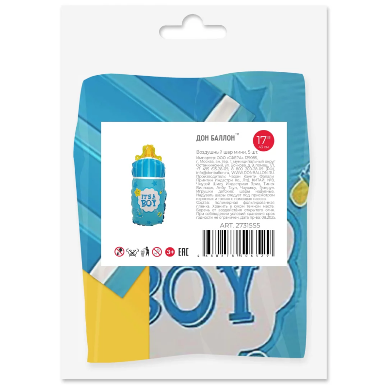 Шар с клапаном (17''/43 см) Мини-фигура, Бутылочка для малыша, Голубой, 5 шт. в уп. (цв.этик.), 27315S5