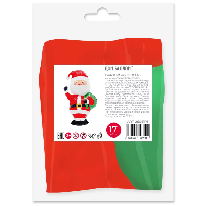 Шар с клапаном (17''/43 см) Мини-фигура, Дед Мороз с подарками, 5 шт. в уп., 25041P5