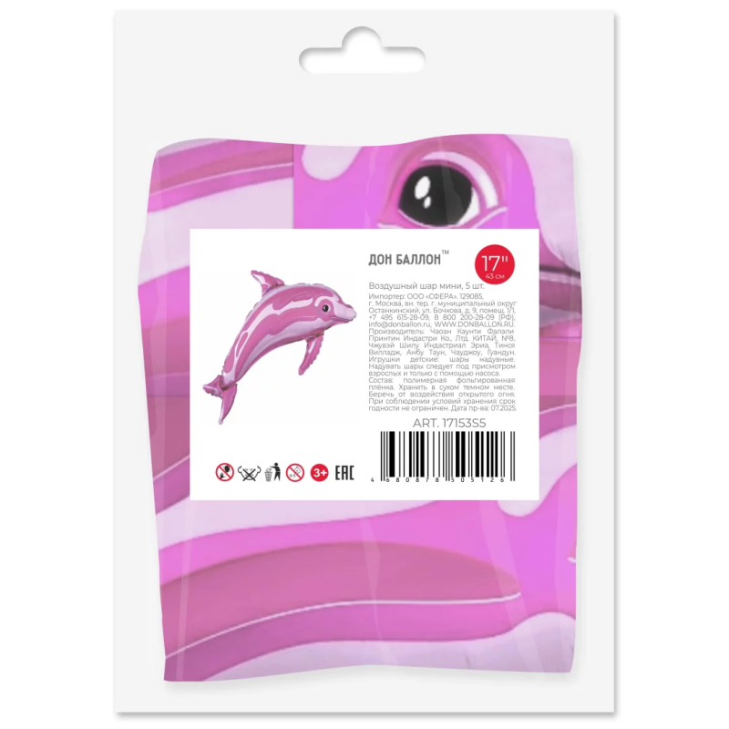 Шар с клапаном (17''/43 см) Мини-фигура, Дельфин, Розовый, 5 шт. в уп. (цв.этик.), 17153S5