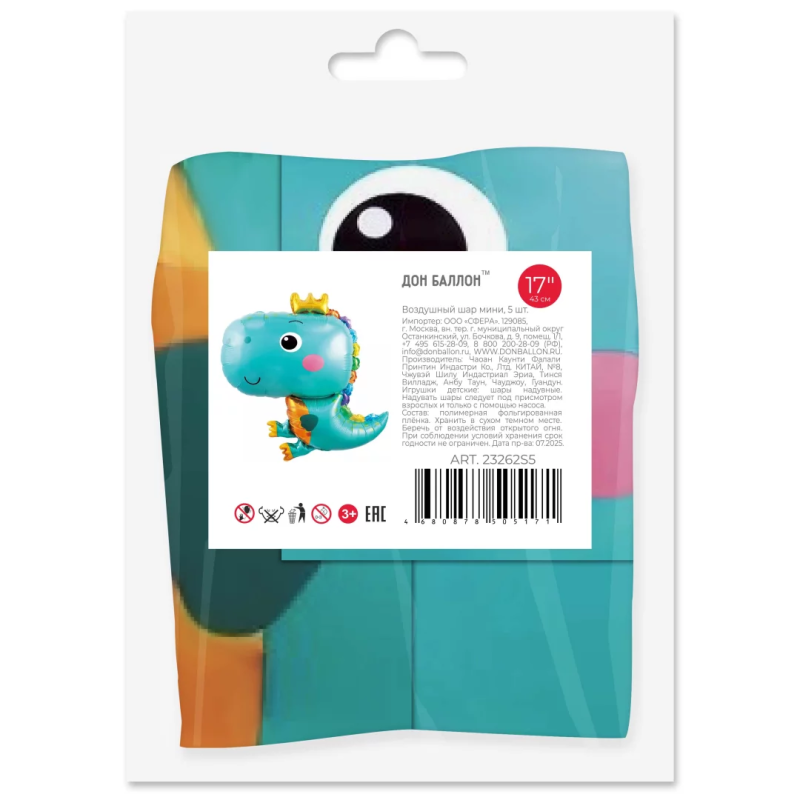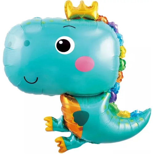 Шар с клапаном (17''/43 см) Мини-фигура, Динозаврик в короне, Бирюзовый, 5 шт. в уп. (цв.этик.), 23262S5