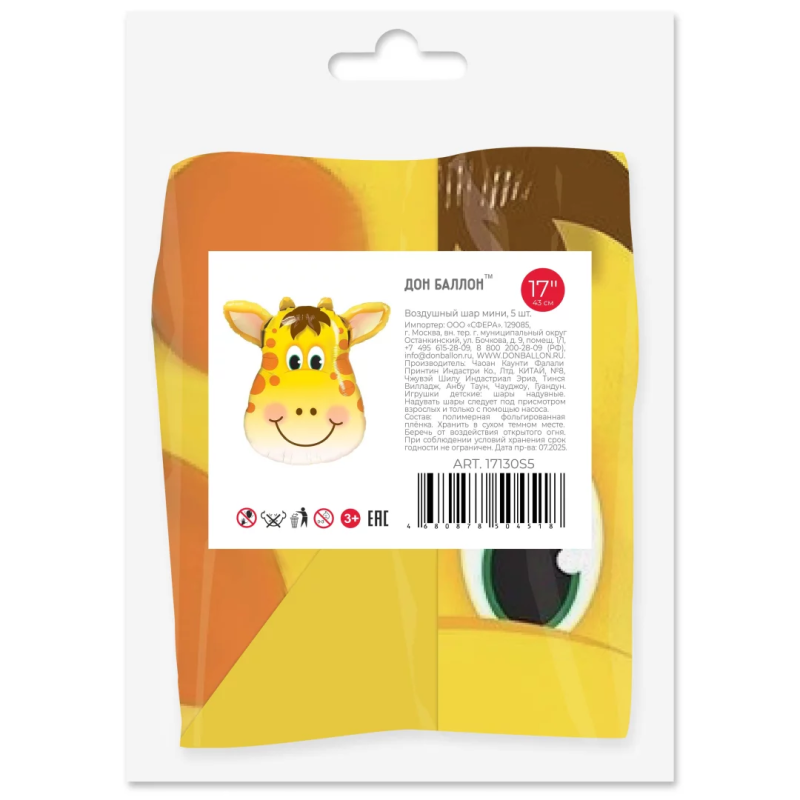 Шар с клапаном (17''/43 см) Мини-фигура, Голова, Милый Жираф, 5 шт. в уп. (цв.этик.), 17130S5
