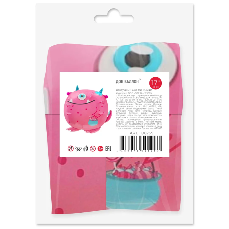 Шар с клапаном (17''/43 см) Мини-фигура, Монстрик Джуди, Розовый, 5 шт. в уп. (цв.этик.), 11987S5