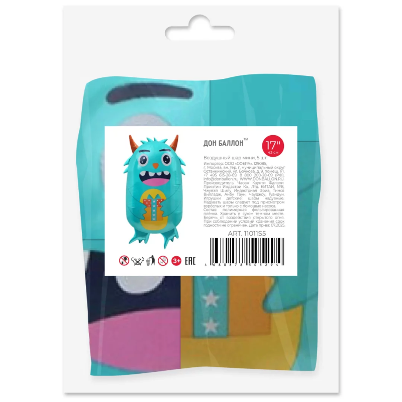 Шар с клапаном (17''/43 см) Мини-фигура, Монстрик Лукас, Бирюзовый, 5 шт. в уп. (цв.этик.), 11011S5